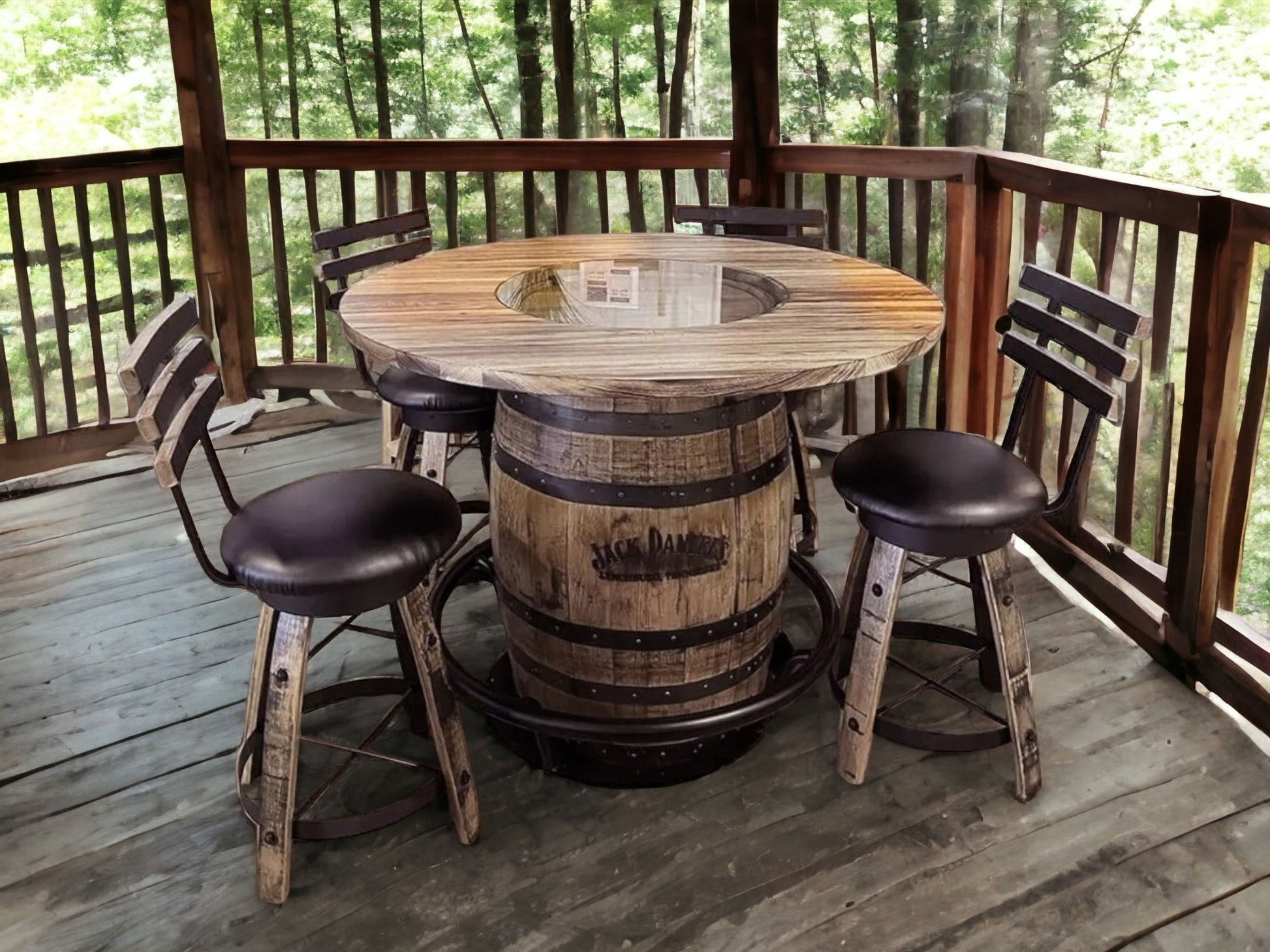 Featuring an authentic Jack Daniel's® whiskey barrel, Metal Footrest, 48" Burnt Hickory Top and 4 cushioned chairs made entirely of barrel staves.Black or Brown Cushions are available. Barrel is branded as seen in photos. Very sturdy set that will be the talk of any party or family get together! Top is removeable and comes with glass inlay. Overall table height is 36". stools are 24" tall stools.